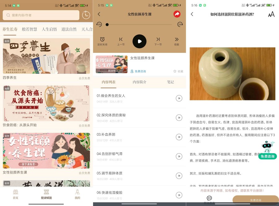 【应用名称】:天天养生 天天养生是一款专注于为用户提供全面健康养生服务的应用,涵盖健康资讯、饮食建议、运动指导、养生知识学习 及 健康管理等功能,旨在帮助用户通过科 学的方式改善生活习惯,提升身心健康,为广大用户,包括众多关注男人健康、女人健康、老人健康等用户群体,提供贴心的养生服务。